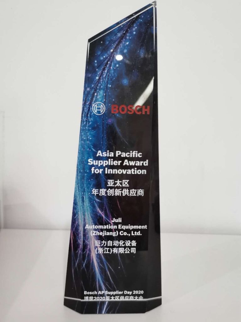 在《博世2020亞太區(qū)供應(yīng)商頒獎儀式》上,巨力自動化公司獨(dú)占鰲頭,從多供應(yīng)商中脫穎而出,獲得了此次博世集團(tuán)頒布的亞太區(qū)供應(yīng)商《亞太區(qū)年度創(chuàng)新供應(yīng)商》獎項。